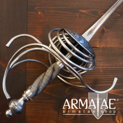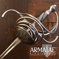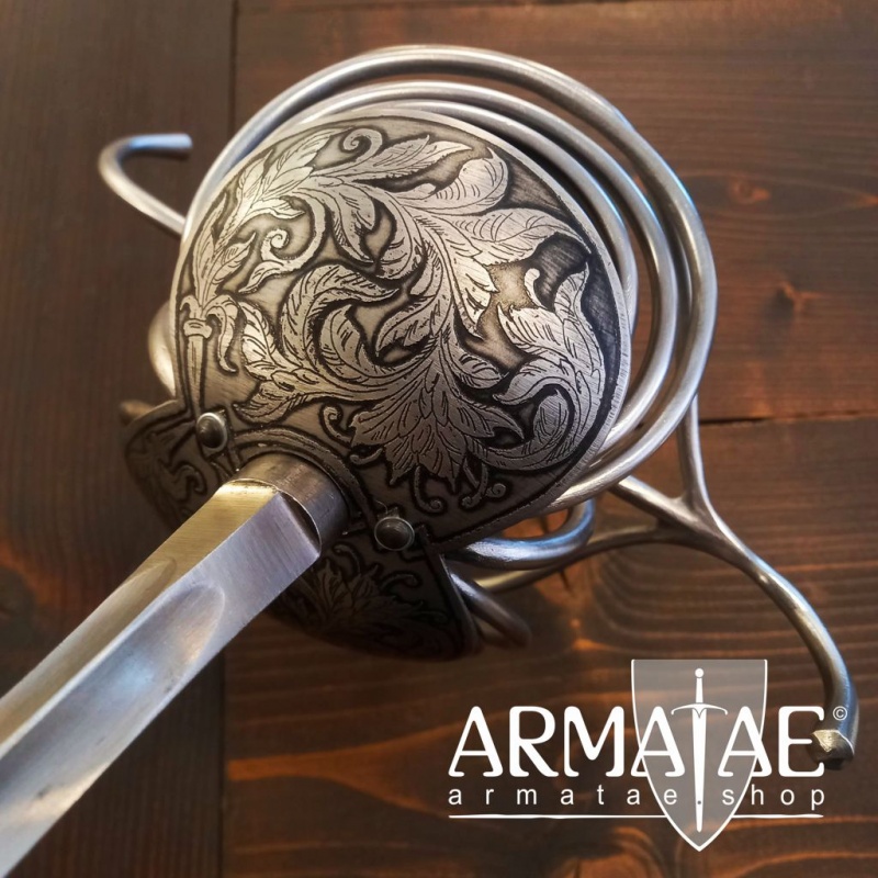 Gediegen und elitär präsentiert sich dieser kunstvoll geätzte Muschel Rapier mit komplettem Korb inkl. Terz und Quart und der geschwungenen Parier. Ein Rapier für den Mann von Welt.