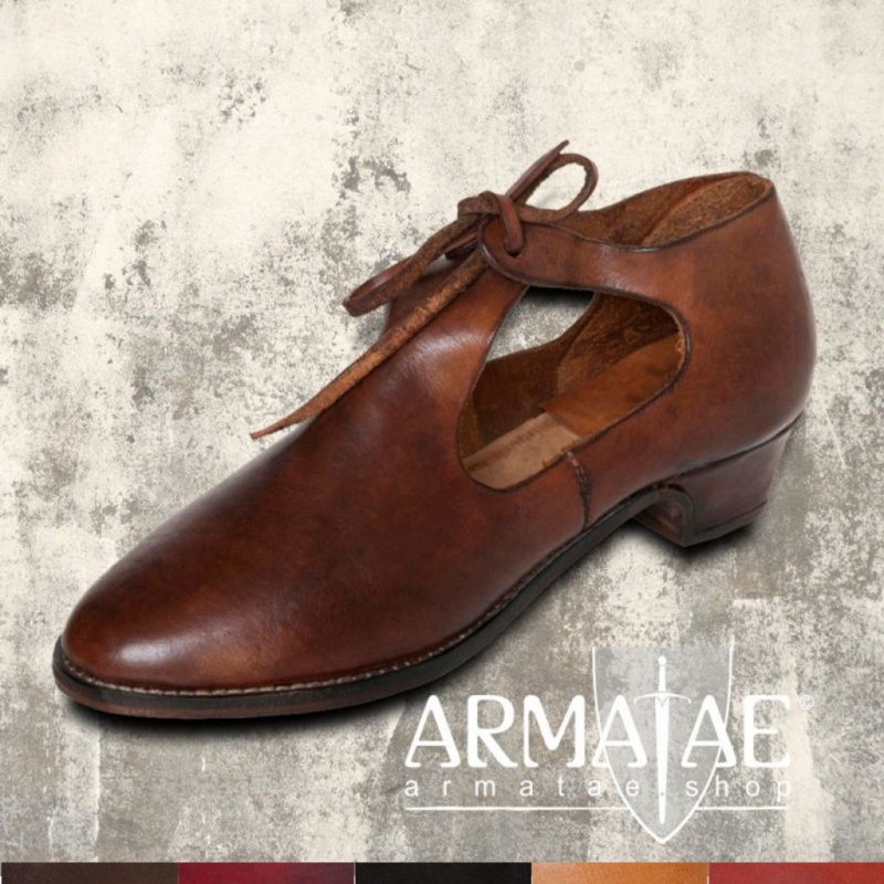 Elegantes Schuhwerk nach Vorlagen aus dem 17. Jhd., mit rahmengenähten Ledersohlen, aufgedoppelt und mit Absätzen versehen.