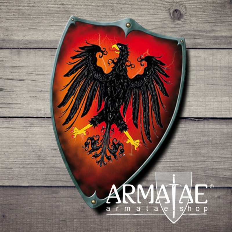 Der Schild besteht aus einer robusten Sperrholzplatte und besitzt auf der Rückseite zwei Haltegurte. Der 3D wirkende Druck in Antik Optik wird die Augen eines jeden kleinen Ritters zum Leuchten bringen.