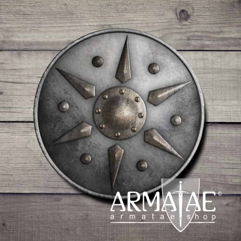 Der Schild mit 40 cm Durchmesser besteht aus einer robusten Sperrholzplatte und besitzt auf der Rückseite zwei Haltegurte. Der 3D wirkende Druck in Antik Stahloptik mit Beschlägen und Buckel wird die Augen eines jeden kleinen Wikingers zum Leuchten bringen.
