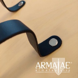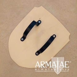Der 35 x 28,2 cm große Schild besteht aus einer stabilen Sperrholzplatte und besitzt auf der Rückseite zwei robuste, fest vernietete Haltegurten aus robustem Leder. Ein Qualitätsprodukt Made in Germany.