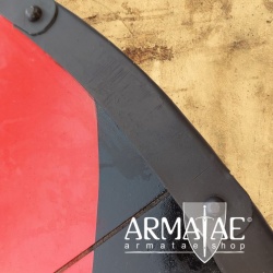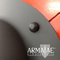 RĂĽckseitig ist der Schild, wie fĂĽr Wikingerschilde typisch, mit einem zentralen und sehr massiven Griff aus Holz ausgestattet.