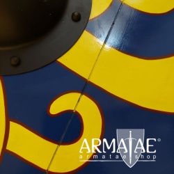 RĂĽckseitig ist der Schild, wie fĂĽr Wikingerschilde typisch, mit einem zentralen und sehr massiven Griff aus Holz ausgestattet.