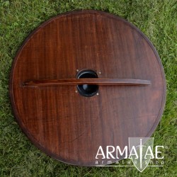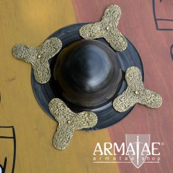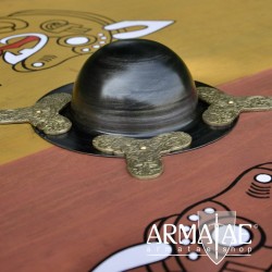 Großer Wikinger Rundschild mit nordischen Pferdemotiven und Schildbuckel aus Stahl, welcher mit 4 Messingbeschlägen befestigt ist. Der Schildrand ist mit Leder bezogen. Die Rückseite besitzt einen großen und für Wikingerschilde typisch zentral montierten Griff aus Holz.