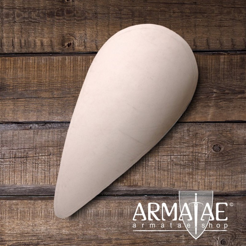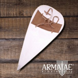 Großer Normannenschild Rohling aus Holz zum Selbstgestalten. Der Schild ist aus mehrschichtigem Holz aufgebaut, mit feinem Segeltuch bespannt, sowie weiß grundiert. Rückseitig sind bereits Riemen und eine Polsterung aus Leder montiert.