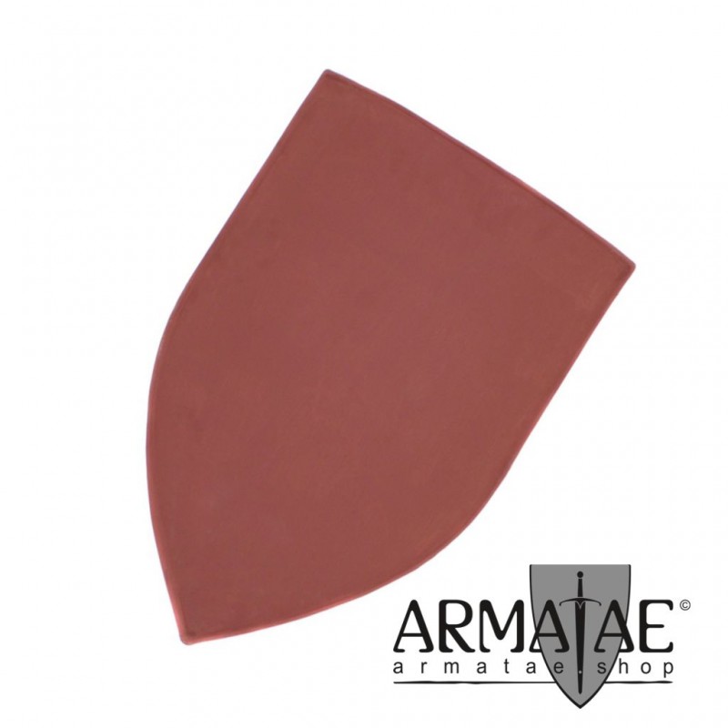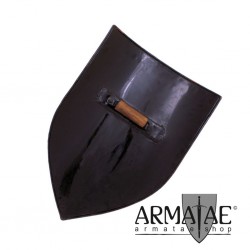 Wappenschild Rohling aus Stahl. Der Schild ist mit Rostschutzfarbe grundiert und somit bereits vorbereitet, um sich sein eigenes Schild zu gestalten. Auf der Rückseite verfügt dieser Schild über einen Faustgriff.