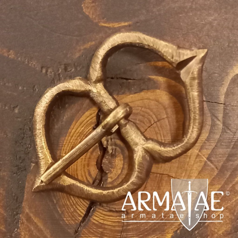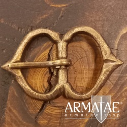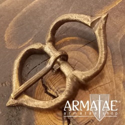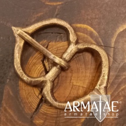 Eine authentische Nachbildung einer Schnalle aus Messing, wie sie im Spätmittelalter weit verbreitet war. Solche Messingschnallen fanden sich an Schuhen, Taschen, Gürtel, Zaumzeug, Bandeliere und sonstigen Riemen.