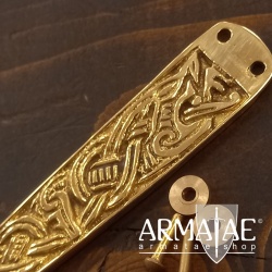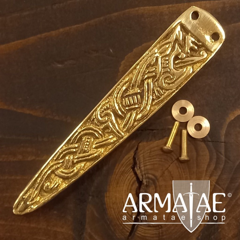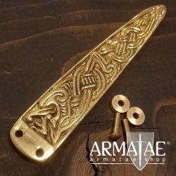 Ein authentischer Nachguss von einem Messing Gürtel Endbeschlag, wie sie von den Wikingern getragen wurden. Das Angebot umfasst den reich verzierten Beschlag, sowie zwei Massiv-Messingnieten.