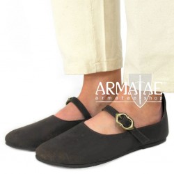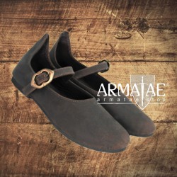 Ein sehr gängiges, beliebtes Paar mittelalterlicher Damenschuhe mit Riemchen und authentischer Schnalle. Gefertigt aus bestem gewachsten Nubukleder werden diese Schuhe zu Kleidern des Hochmittelalters, aber auch bis ins Spätmittelalters hinein getragen.