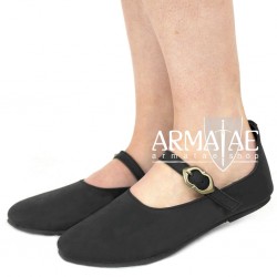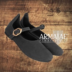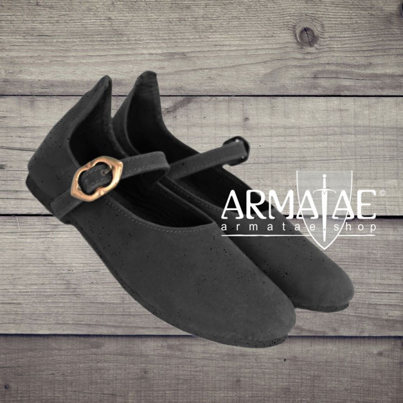 Ein sehr gängiges, beliebtes Paar mittelalterlicher Damenschuhe mit Riemchen und authentischer Schnalle. Gefertigt aus bestem gewachsten Nubukleder werden diese Schuhe zu Kleidern des Hochmittelalters, aber auch bis ins Spätmittelalters hinein getragen.
