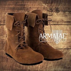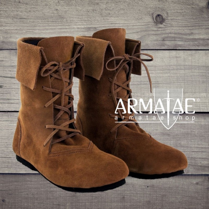 Ein sehr ansehnliches Paar mittelalterlicher Stulpenstiefel in halbhoher Variante, wie man sie im späten Hochmittelalter und vor allem im Spätmittelalter häufig vorfand. Ein optisch beinahe alltagstauglicher, moderner Schnitt, sehr robust aus ca. 4 mm starkem Veloursleder mit 2 mm starker aufgenähter Stulpe, welche ebenfalls aus Veloursleder besteht. Die Schuhe besitzen, wie Schuhe von heute, bereits eine am Rist verlaufende Schnürung mit dahinterliegender Lasche, so können die Schuhe auch dank dem geschmeidigen Veloursleder sehr fest gebunden werden, um stabilen Halt zu geben.