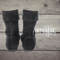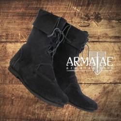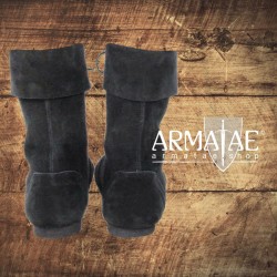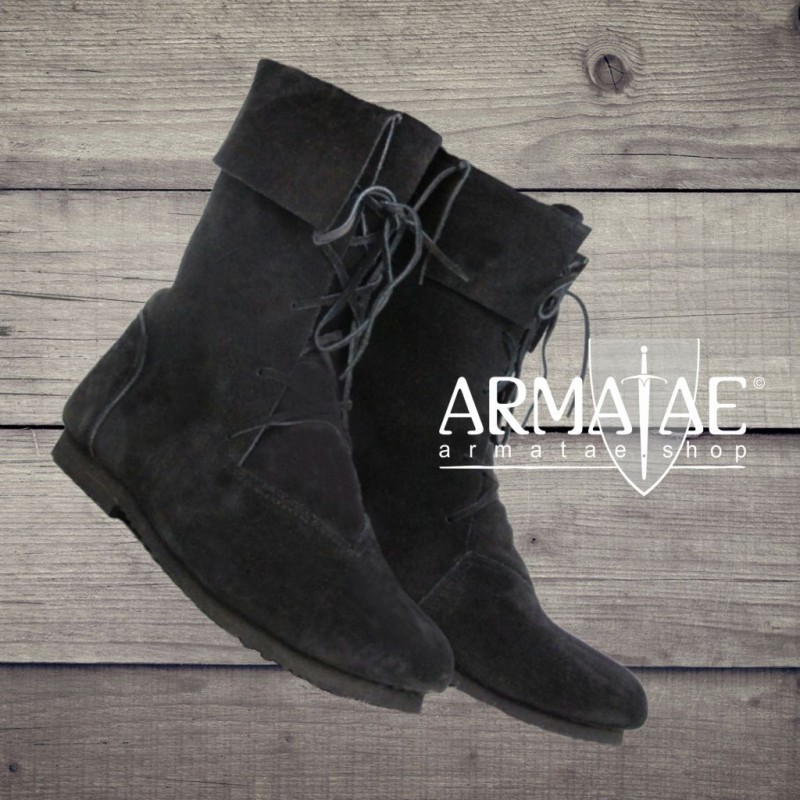 Ein sehr ansehnliches Paar mittelalterlicher Stulpenstiefel in halbhoher Variante, wie man sie im späten Hochmittelalter und vor allem im Spätmittelalter häufig vorfand. Ein optisch beinahe alltagstauglicher, moderner Schnitt, sehr robust aus ca. 4 mm starkem Veloursleder mit 2 mm starker aufgenähter Stulpe, welche ebenfalls aus Veloursleder besteht. Die Schuhe besitzen, wie Schuhe von heute, bereits eine am Rist verlaufende Schnürung mit dahinterliegender Lasche, so können die Schuhe auch dank dem geschmeidigen Veloursleder sehr fest gebunden werden, um stabilen Halt zu geben.