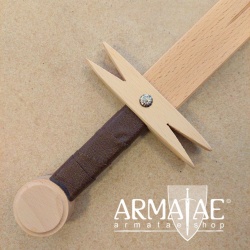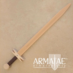 Das Schwert in hochmittelalterlicher Form besitzt eine schöne Parierstange, einen großen Knauf aus Buchenholz und der Griff ist mit Kunstleder umwickelt.