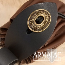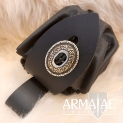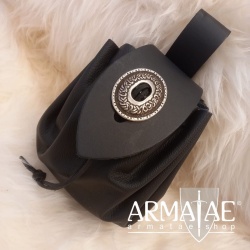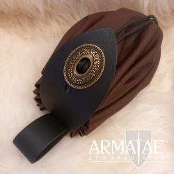 Die schmückende Verschlussscheibe ist an dem Lederriemen, der den Beutel verschließt, befestigt und wird durch einen Schlitz im Deckel geschoben. Die Mittelalter-Geldkatze ist aus einem samtig-weichen Nappaleder von ca. 1 mm Stärke und einem festen Leder mit mindestens 2 mm Stärke für die Taschenklappe gearbeitet. Auf der Rückseite der Beuteltasche befindet sich eine Gürtel-Schlaufe für Gürtel bis zu 7 cm Breite.