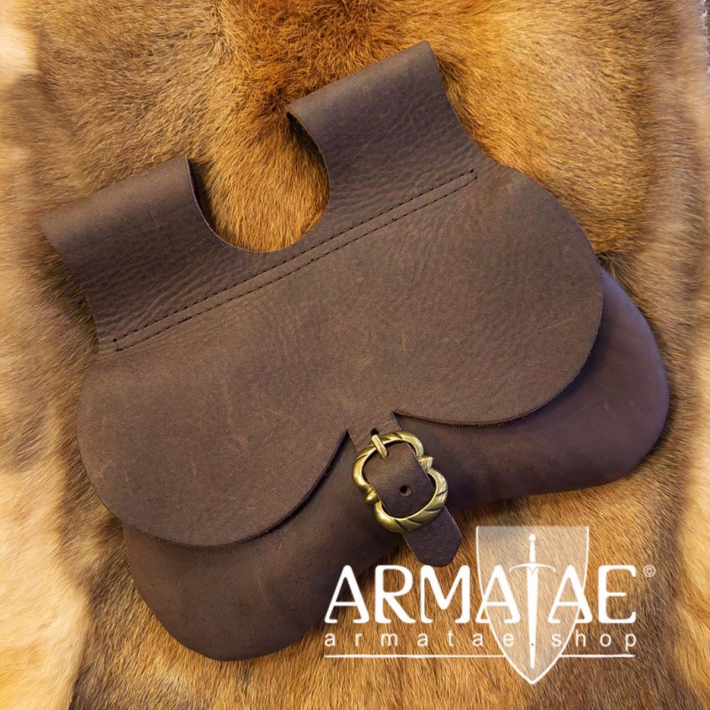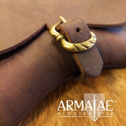 Die detailgetreue Replik einer mittelalterlichen Schnalle nach einem historischen Vorbild ist der Blickfang auf der Vorderseite der Nierentasche und sorgt für einen sicheren Verschluss.