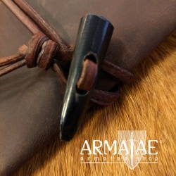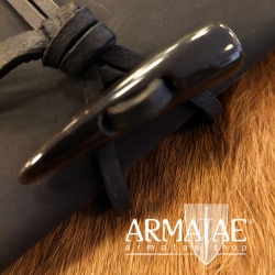 In die Taschen passen die meisten Tabakpackungen, 2 weitere Fächer sind für Feuerzeug oder Streichhölzer eingebaut, sowie eine Schleife, wo die Papers verlustsicher Platz finden. Der Knopf am umlaufend angebrachten Lederband besteht aus natürlichem Horn des Wasserbüffels.