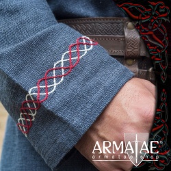 Aufwendig von Hand am Dekolleté und den Ärmeln mehrfarbig bestickte Wikinger Tunika mit Schlitzen an den Seiten, sowie Schlitz am Dekolleté im weitem, authentischen Stil. Gefertigt aus fester, grober Baumwolle.