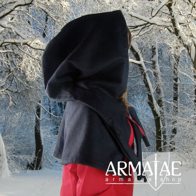 Warme und vorne zu bindende Gugel mit langer Kapuze aus hochwertiger Wolle und Innenfutter aus reiner Baumwolle.