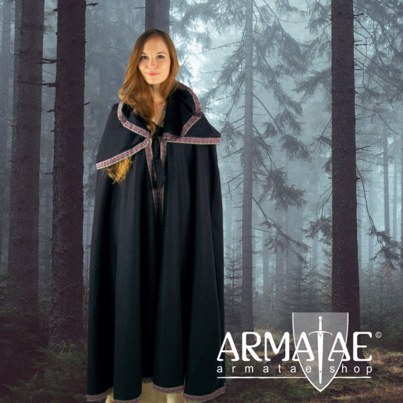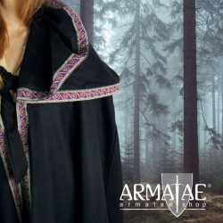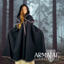 Ein Traum von einem mittelalterlichen Umhang, wie aus einer Blockbuster Märchen Verfilmung, mit großer weiter Kapuze, welche auch die Schultern bedeckt und so doppelten Schutz bietet. Sämtliche Konturen des Umhanges und der großzügig designeten Kapuze sind mit zierenden Bordüren, welche ein typisch mittelalterliches Muster zeigen besetzt.