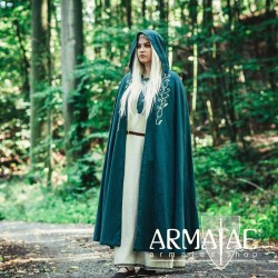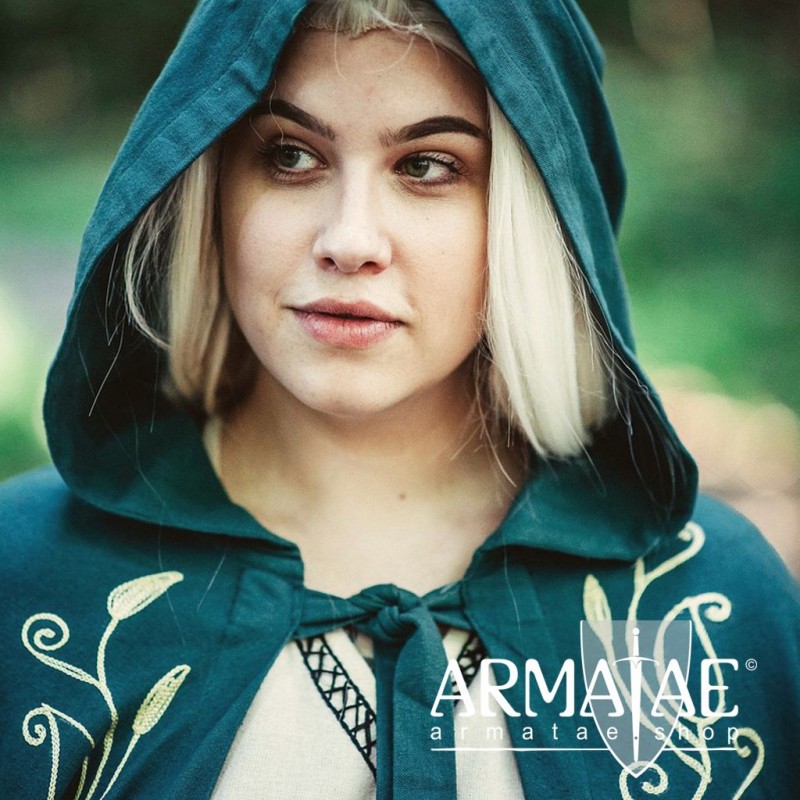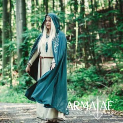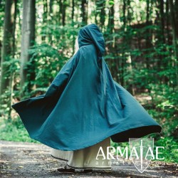 Ein zauberhafter, anmutig wirkender Umhang, welcher sich für alle mittelalterlichen Veranstaltungen bestens eignet. Der Umhang umhüllt dich mit einer Breite von ca. 231 cm und einer Länge ab Schulter von ca. 130 cm und schützt dich so zusammen mit seiner großzügig gestalteten Kapuze  auch verlässlich vor Wind und Kälte.