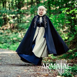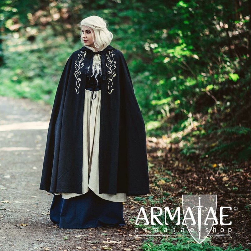 Ein zauberhafter, anmutig wirkender Umhang, welcher sich für alle mittelalterlichen Veranstaltungen bestens eignet. Der Umhang umhüllt dich mit einer Breite von ca. 231 cm und einer Länge ab Schulter von ca. 130 cm und schützt dich so zusammen mit seiner großzügig gestalteten Kapuze  auch verlässlich vor Wind und Kälte.