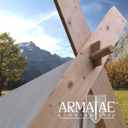 Unsere Gestänge sind aus unbehandeltem Fichtenholz aus dem bayrischen Wald und weiter nicht veredelt, also unbehandelt, wie es auch authentisch ist. Es gab jedoch auch prunkvoll gestaltete Gestänge, bunt bemalt, gedrechselt, auch mit Blattgold, Schnitzereien usw., wo eurer Fantasie keine Grenzen gesetzt sind. Zum besseren Schutz vor Nässe und um dem Verwittern des Holzes vorzubeugen ist es sicher von Vorteil, wenn das komplette Zeltgestänge nachbehandelt wird. Ob nun schön glatt geschliffen und farblos gebeizt, oder gefirnisst, geölt, lackiert u.s.w., das Holz dankt es euch mit längerer Haltbarkeit. Vor allem die Bereiche, welche am Boden stehen, bzw. am Zeltdach der Witterung ausgesetzt sind, sollten sinnvollerweise geschützt werden. Bedingt durch die vielen verschiedenen Möglichkeiten des Holzschutzes und der Gestaltungsmöglichkeiten des Gestänges wird dieses naturbelassen geliefert, so wie es auch im Mittelalter meist zur Anwendung kam und nur so die von euch gewünschte Veredelung des Gestänges möglich bleibt.