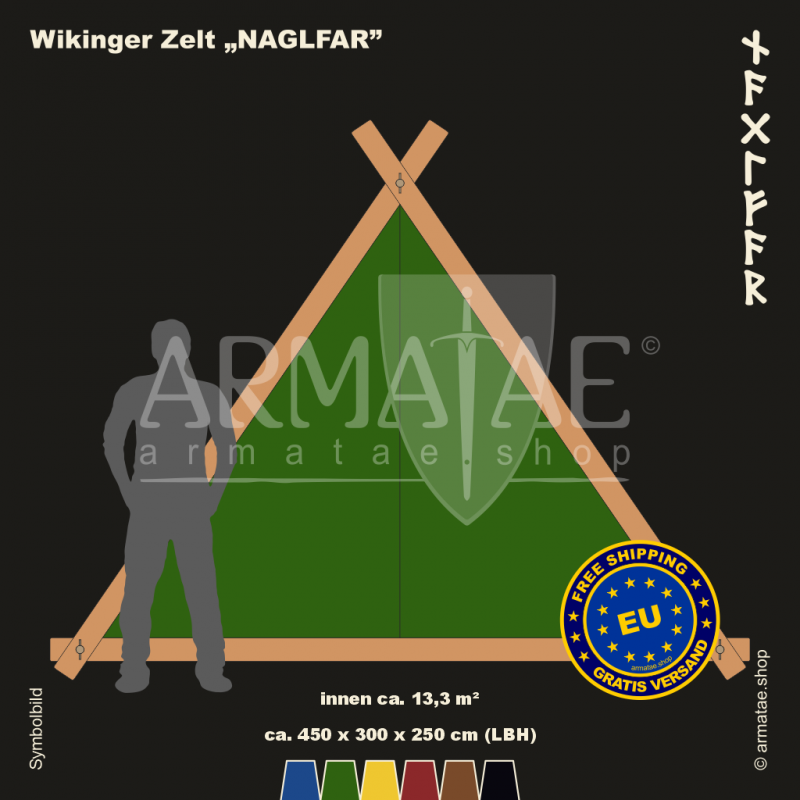 Das Wikingerzelt-Komplett-Set "NAGLFAR" gibt es in 6 verschiedenen Farben, besitzt an beiden Stirnseiten Ein- / Ausgänge mit klassischen authentischen Schlaufen-Ösen Verschlüssen, perfekt um schnell durchzulüften. Die Seiten weisen zudem einen durchlaufenden Bodensaum auf, welcher Zugluft minimiert.