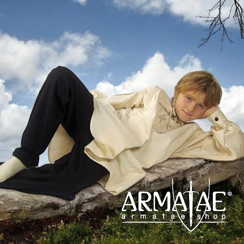 Dieses traditionelle, weit geschnittene Hemd mit Stehkragen passt nicht nur zu mittelalterlichen Gewandungen, sondern macht z.B. auch zu einer zünftigen Lederhose eine sehr gute Figur. Gegenüber reinen Leinenhemden knittert dieser Baumwoll-Leinen-Mix weit weniger und ist zudem weicher.