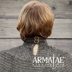 Der Bischofskragen besitzt einen authentischen Abschluss mit Zacken, wie er im Spätmittelalter sehr verbreitet war und vom Landsknecht gerne verwendet wurde. Am Nacken angebracht sind 2 robuste Lederriemen mit authentischen Messing-Schnallen.