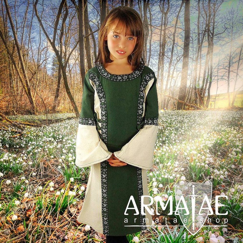 Aufwendig und hochwertig gearbeitetes Prinzessinenkleid aus reiner Baumwolle mit weiten Ärmeln in Glockenform. Das Kleid ist 2-fach über die gesamte Vorderseite, an den Armen und am Dekolletee mit farblich abgestimmten und mittelalterlich anmutenden Bordüren besetzt.