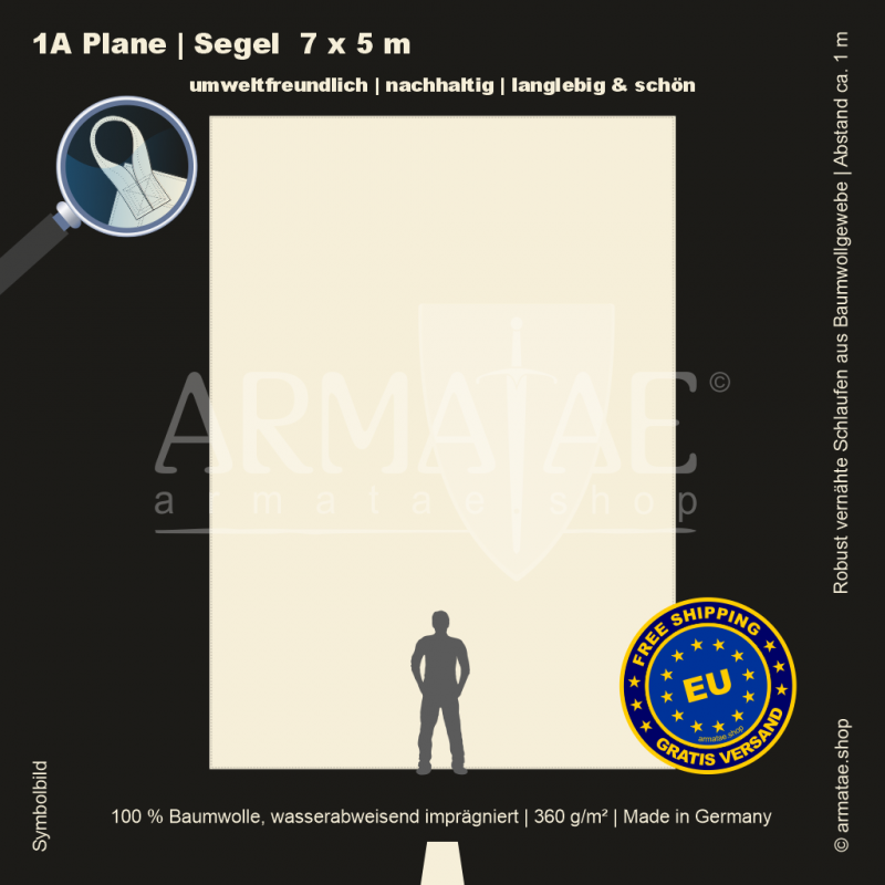 Schwere Sonnenschutz & Regenschutz Plane aus wasserabweisend imprägniertem 100 % Baumwollgewebe mit 360g/m². Für unzählige Einsatzbereiche, ob mobil oder für den Dauereinsatz fest montiert. Umlaufend gesäumt und mit Schlaufen aus Planenmaterial im Abstand von 1 m von Hand gefertigt. 5 Jahre Garantie auf die äußerst robuste Verarbeitung.