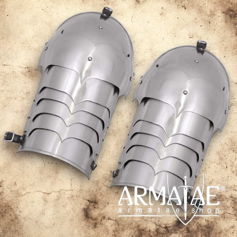 Massive Schulterplatten (je 6-teilig) aus 1,6 mm Stahl, welche für den Schaukampf geeignet sind. Die Schulterplatten werden als Paar ausgeliefert und sind zur Montage an z.B. einem Gambeson gedacht.