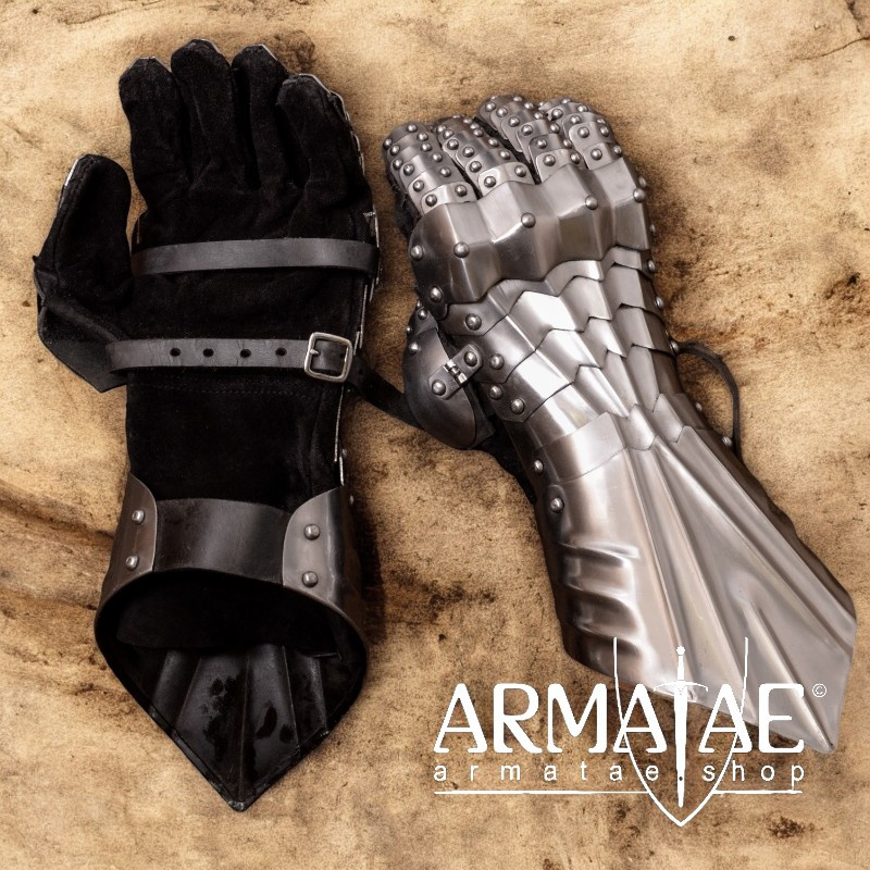 Hochwertige von Hand gefertigte Plattenhandschuhe vernietet und innen an geschmeidigen Lederhandschuhen vernäht. Gefertigt aus 1,3 mm Stahl und für den Schaukampf geeignet. Diese Rüstungshandschuhe werden im Paar ausgeliefert.