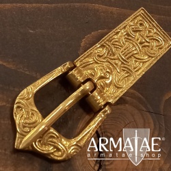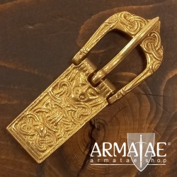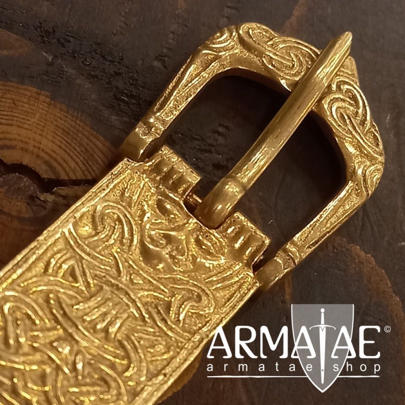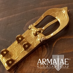 Die bewegliche, aus vier Einzelteilen zusammengefügte Schnalle ist komplett aus Messing gefertigt und besitzt auf der Rückseite 4 Laschen für die Befestigung am Gürtel.