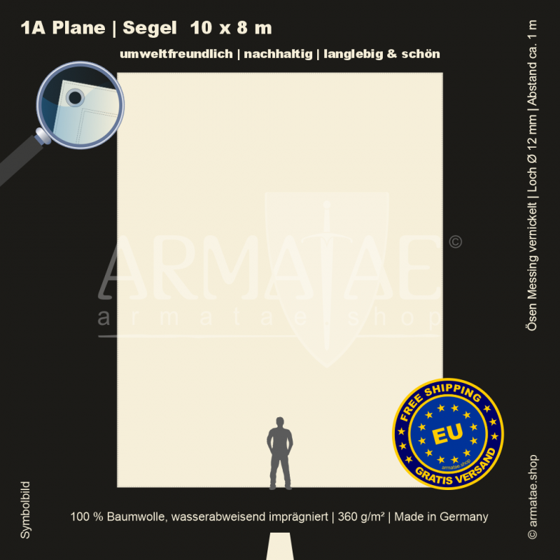 Schwere Sonnenschutz & Regenschutz Plane aus wasserabweisend imprägniertem 100 % Baumwollgewebe mit 360g/m². Für unzählige Einsatzbereiche, ob mobil oder für den Dauereinsatz fest montiert. Umlaufend gesäumt und mit rostfreien Ösen aus vernickeltem Messing mit einem Innendurchmesser von 12 mm im Abstand von 1 m von Hand gefertigt. 5 Jahre Garantie auf die äußerst robuste Verarbeitung.
