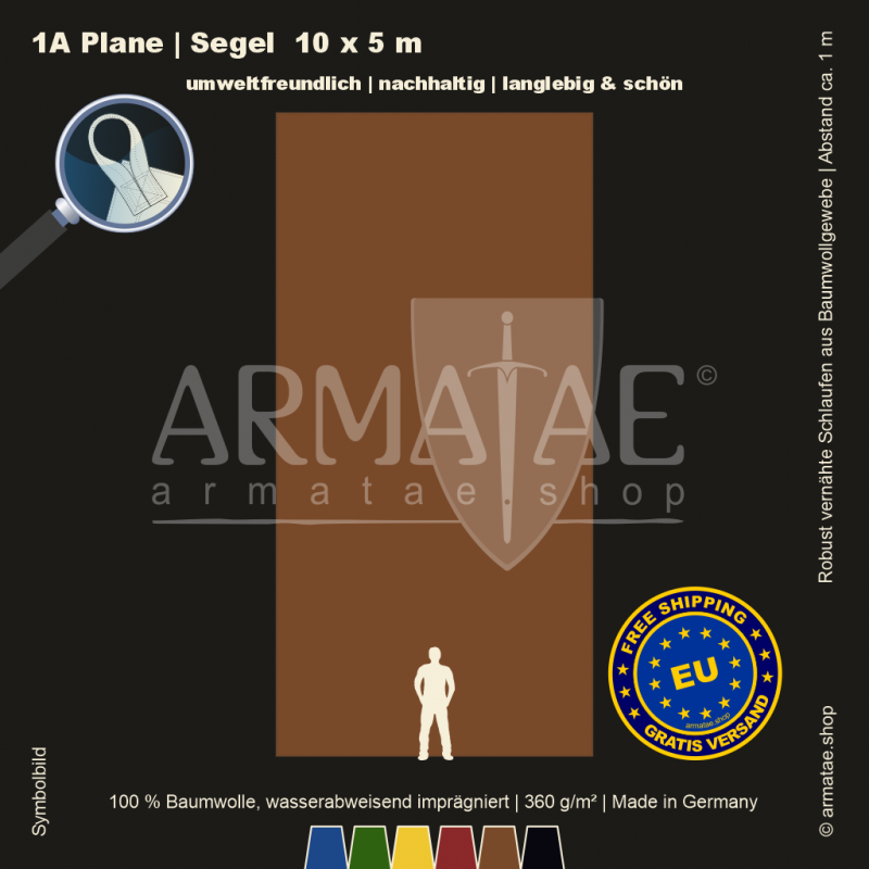 Schwere Sonnenschutz & Regenschutz Plane aus wasserabweisend imprägniertem 100 % Baumwollgewebe mit 360g/m². Für unzählige Einsatzbereiche, ob mobil oder für den Dauereinsatz fest montiert. Umlaufend gesäumt und mit Schlaufen aus Planenmaterial im Abstand von 1 m von Hand gefertigt. 5 Jahre Garantie auf die äußerst robuste Verarbeitung.