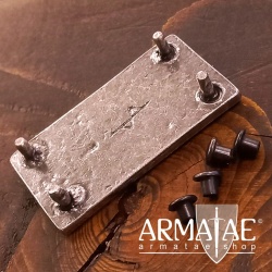 Die Zierplatte besitzt auf der Rückseite an jeder Ecke einen Stift mit ca. L 5,5 x D 2,5 mm. Mit vier beiliegenden Nietenköpfen kann der Beschlag einfach mit gefühlvollem Festklopfen mit einem Hammer am Leder montiert werden. Bei dünneren Leder kann man die Stifte einfach mit einer Metallfeile kürzen (Kanten danach fein fasen). Geeignet zur Verzierung von Gürteln, Taschen u.v.m.