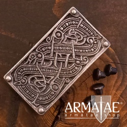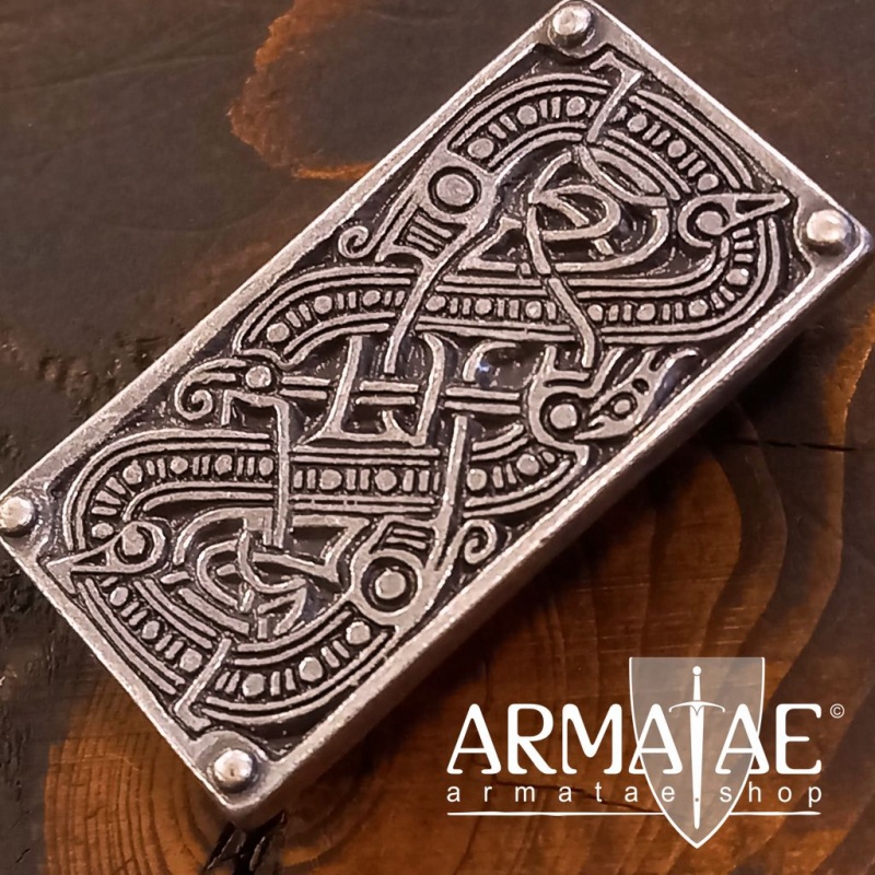 Diese detailliert ausgearbeitete 4-fach Nietenplatte der Vendelzeit ist nach einem historischen Vorbild aus Valsgärde in Schweden gefertigt und zeigt zwei ineinander verbissene Schlangen oder Drachen.