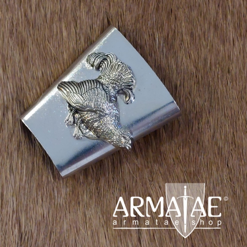 Diese Federhülse ist ca. 40 mm lang und 36 mm an der oberen Öffnung breit. Die Hülse besitzt ein dreidimensionales Emblem eines Spielhahns bzw. Birkhahns und ist ansonsten glatt ausgeführt. Rückseitig befindet sich eine Nadel mit Zuhaltehaken zur einfachen Befestigung am Hut oder dem Hutband.