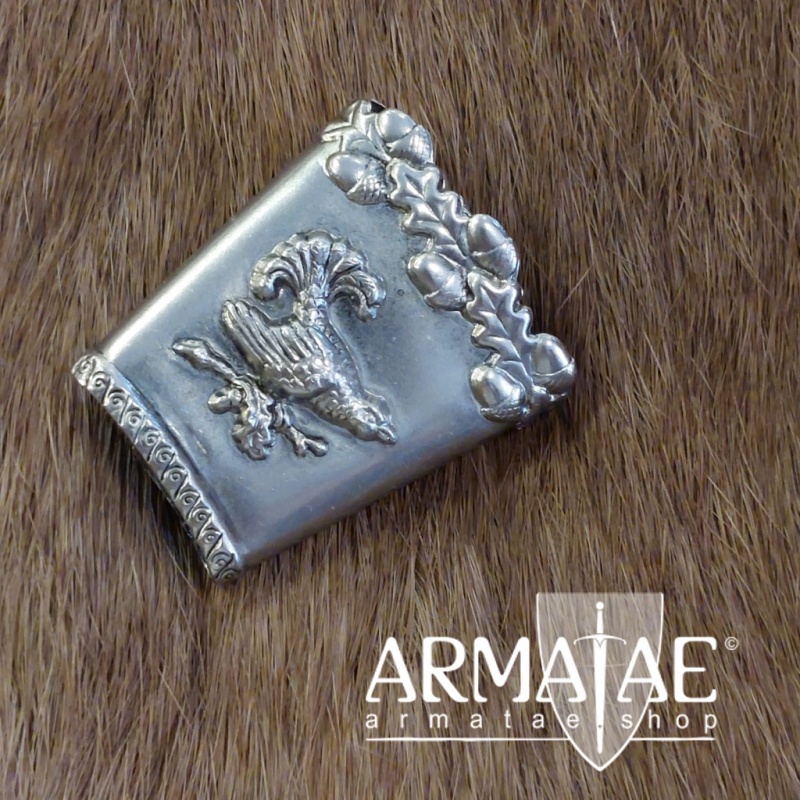Diese Federhülse ist ca. 36 mm lang und 32 mm an der oberen Öffnung breit. Die Hülse besitzt ein dreidimensionales Emblem eines Spielhahns bzw. Birkhahns, oben ziert ein Eichenlaubkranz mit Eicheln den Rand, unten ist umlaufend ein Bandmuster eingeprägt. Rückseitig befindet sich eine Nadel mit Sicherheitsverschluss zur einfachen Befestigung am Hut oder dem Hutband.