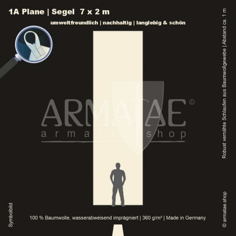 Schwere Sonnenschutz & Regenschutz Plane aus wasserabweisend imprägniertem 100 % Baumwollgewebe mit 360g/m². Für unzählige Einsatzbereiche, ob mobil oder für den Dauereinsatz fest montiert. Umlaufend gesäumt und mit Schlaufen aus Planenmaterial im Abstand von 1 m von Hand gefertigt. 5 Jahre Garantie auf die äußerst robuste Verarbeitung.