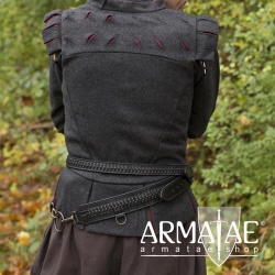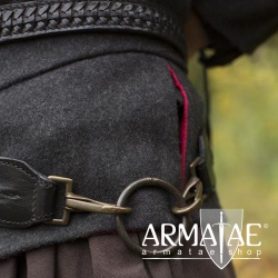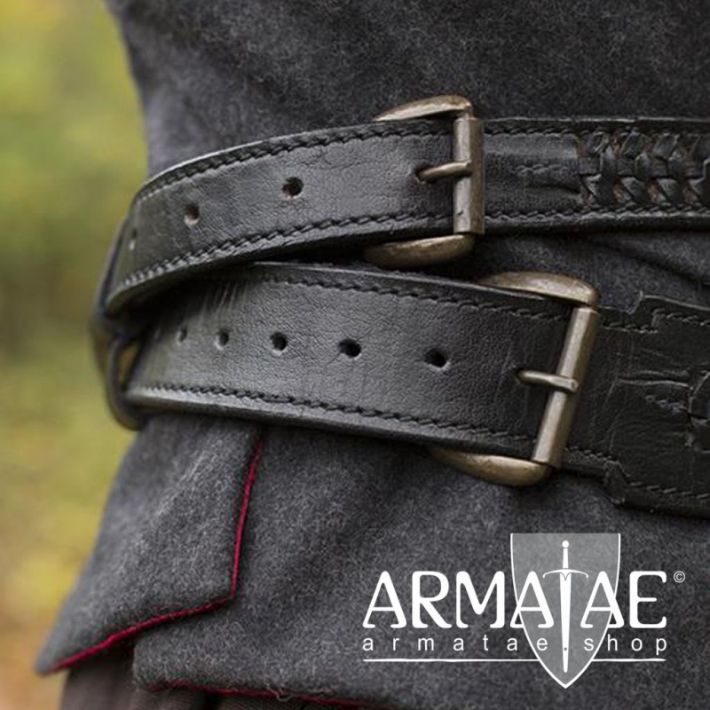 Den schmäleren Gürtel trägt man fest an der Mitte, während der breite Gürtel auf der linken Seite leger tiefer hängt, wo im großen Metallring die meisten LARP oder Schaukampfschwerter Platz finden.