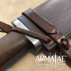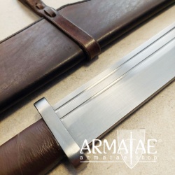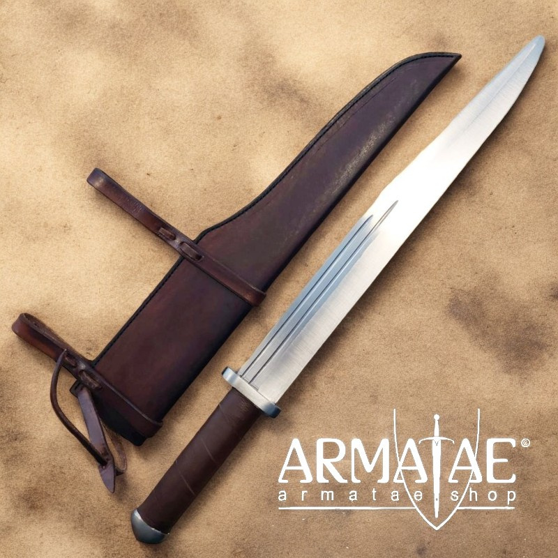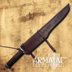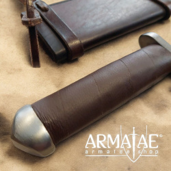 Dieser perfekt ausgewogene Sax lässt sich wunderbar leicht führen. Der Schwerpunkt liegt 6 cm vor der Parierstange und die 4 mm starke Battle-Klinge steckt Schläge sehr gut weg. Eine Augenweide, die von Hand gemachte Lederscheide mit den traditionell aufgebundenen Gürtelschlaufen, ganz ohne Nieten. Das Sicherungsriemchen lässt sich mit einer Hand öffnen sowie schließen und verhindert den Verlust der Waffe.